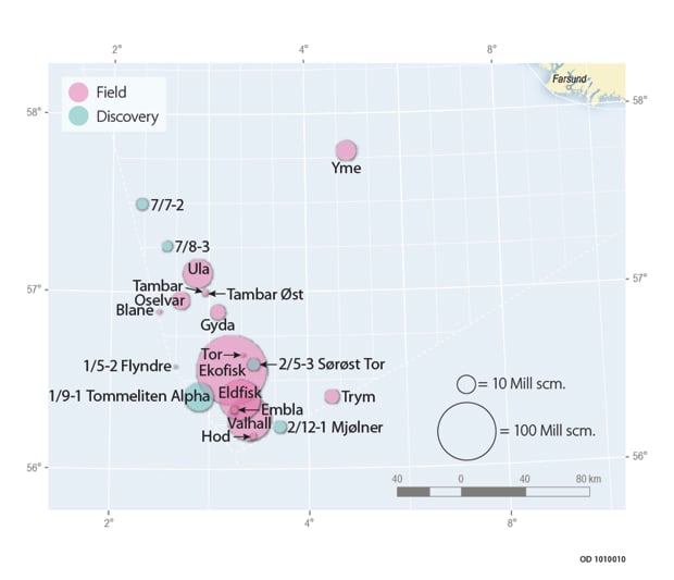 Figur 2.26 Fields and discoveries in the central part of the North Sea. The size of the circle indicates the total remaining resource volume.