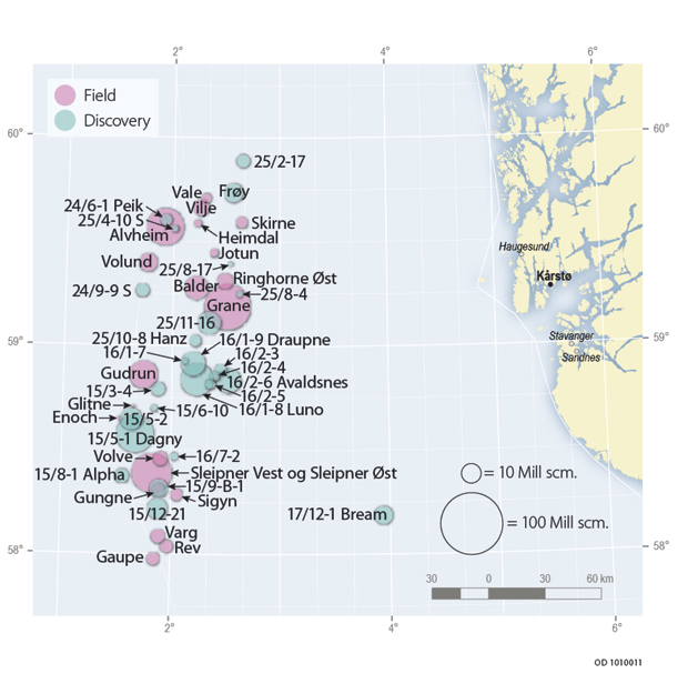 Figur 2.27 Fields and discoveries in the northern part of the North Sea. The size of the circle indicates the total remaining resource volume.