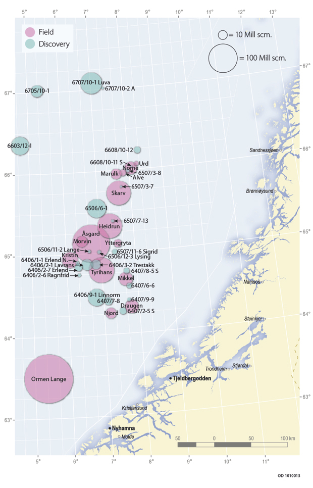 It has been proven that the Norwegian Sea contains a lot of gas. Produced gas from the fields is transported in the ÅTS pipeline to Kårstø in Rogaland, and in Haltenpipe to Tjeldbergodden in Møre og Romsdal. The gas from Ormen Lange runs in a pipeline to Nyhamna, and from there on to the United Kingdom. The CO2 content of the gas produced from several of these fields is relatively high, which is also the case for several of the discoveries in the area. Gas from these fields is therefore blended with other gas with lower CO2 content to achieve compliance with gas quality requirements. This blending takes place from fields both in the Norwegian Sea and from fields located further south. This creates interdependence between the fields in the Norwegian Sea, and affects how the individual fields are produced.