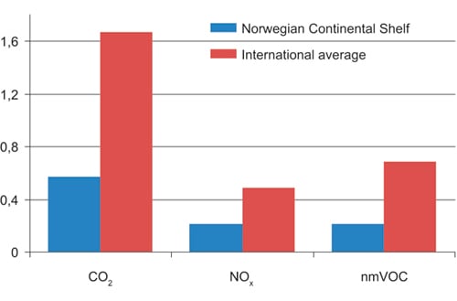 As a consequence of a number of policy instruments established through more than 40 years of petroleum activity as well as strong focus on limiting emissions/discharges on the part of authorities and companies, the Norwegian Shelf is among the best in the world when it comes to emissions to air per produced unit, cf. Figure 7.1.