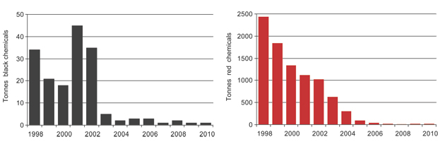 After the goal of zero discharges of oil and environmentally hazardous substances was introduced in 1997, discharges of chemicals in the black category have been reduced from 34 tonnes in 1998 to scarcely 1 tonne in 2010, cf. Figure 7.2. Discharges of chemicals in the red category have been reduced from 2440 tonnes to 16 tonnes in the same period. More than 99 per cent of all environmentally hazardous chemicals have been removed during the last ten years. About 80 per cent of the total chemical discharges occur in connection with drilling and well operations.