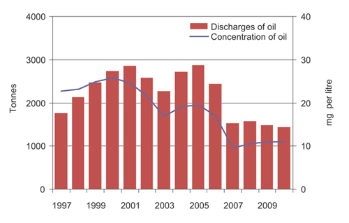 The concentration of oil in the produced water discharged to sea in 2009 was about 11 mg per litre. This is well below the maximum level of 30 mg per litre, stipulated in national regulations based on resolutions in the OSPAR Convention for the protection of the marine environment of the northeast Atlantic.