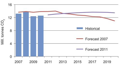 It is difficult to estimate the future development in an industry. A number of factors influence greenhouse gas emissions. Projections are therefore based on a number of technical assumptions for calculation purposes. The uncertainty in the prognoses is also easily illustrated by comparing previous projections with actual emissions. The emissions from the petroleum sector up to 2010 have, for example, been lower than estimates indicated in the spring of 20072. However, the latest emission projections indicate an upward adjustment of the emissions in 2020 by about 23 per cent, from the same point in time, cf. Figure 7.5.