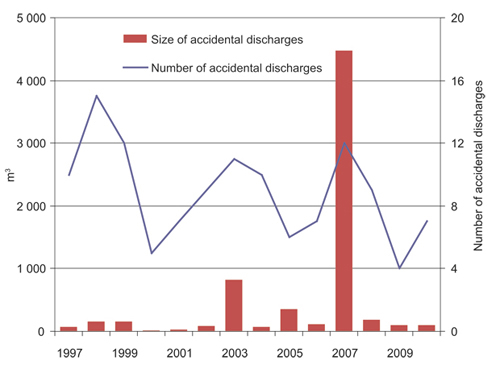 The great majority of acute discharges are small, but some larger oil spills can also occur. There were 139 acute discharges of oil in 2010, of which 132 were less than one cubic metre. The total volume of all the discharges was 105 m3, cf. Figure 7.6.