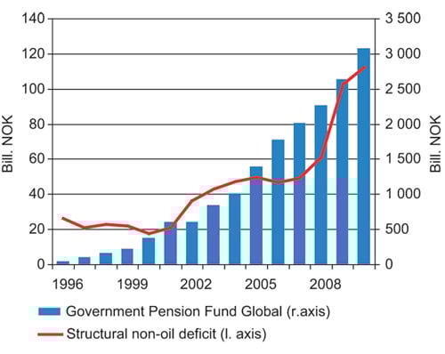 The State’s revenues from the petroleum sector constitute about 25 per cent of the State’s total income. The cash flow from the petroleum activities is transferred in its entirety to the Government Pension Fund Global, previously known as the Norwegian Government Petroleum Fund. The purpose of the Government Pension Fund is to support government savings to finance the pension expenditure of the National Insurance scheme and long-term considerations in the spending of government petroleum revenues. Over time, the central Government structural non-oil budget deficit shall correspond to the expected real return on the Government Pension Fund Global, estimated at 4 per cent. This fiscal policy guideline is not exercised mechanically, however, and considerable emphasis is placed on stabilising economic fluctuations. The guideline thus entails a gradual increase in use of the petroleum revenues up to a level that can be sustained over the longer term, cf. Figure 9.1. The Government Pension Fund Global invests in financial assets outside Norway. The guideline and the administration of the Government Pension Fund Global is explained in more detail in the annual national budgets and in the report to the Storting on the Government Pension fund.