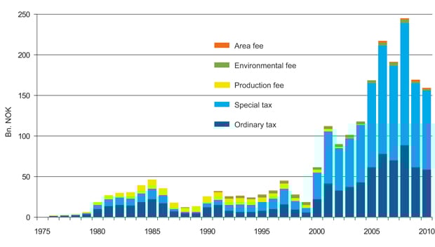 In addition to tax, the companies also pay environmental taxes and area fees,. Environmental taxes and area fees amounted to about NOK 3.6 billion in 2010.