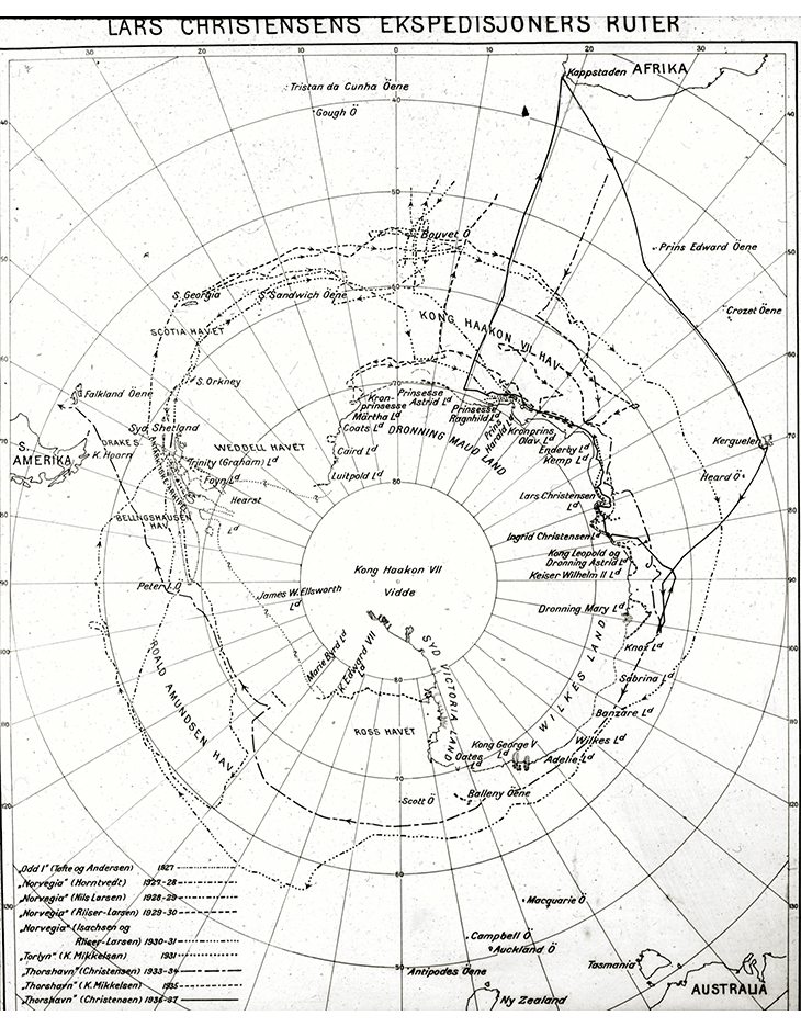 Figure 3.6 Map showing the routes taken by Lars Christensen’s expeditions.