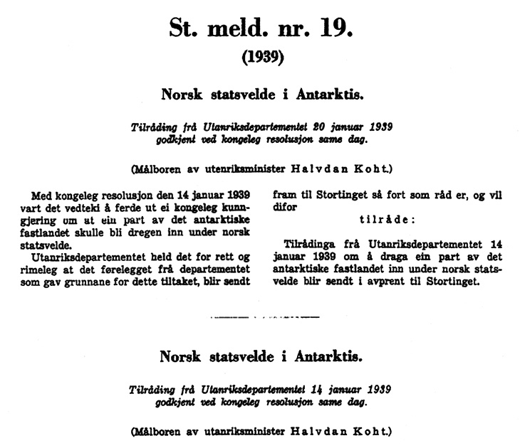 The issue of potential Norwegian annexation of the area between the Falkland Islands Dependencies in the west and the Australian Antarctic Territory to the east was raised with the British Government in a memorandum on 26 January 1934. Notification was provided at the same time that the Norwegian Government might consider holding an international conference to discuss the Antarctic situation, but that it was thought bilateral Norwegian-British talks would be the most practical way to proceed. Among Norway’s objectives in these discussion, was clarification of the maritime boundary issue in the Antarctic. In a note of reply of 23 October 1934, the United Kingdom stated that it agreed with the Norwegian view and indirectly encouraged Norway to proceed with annexation. However, despite the seemingly favourable circumstances, the Norwegian government chose to maintain a policy of reticence for quite some time. That ended abruptly with an incident that dramatically focused Norway’s attention. In December 1938 Adolf Hoel, the polar researcher and head of Norway’s «Svalbard- og Ishavsundersøkelser» (precursor of today’s Norwegian Polar Institute), found out that on 17 December 1938 Germany had dispatched an expedition to the Antarctic. Both the expedition and its purpose were shrouded in secrecy, but the information Hoel had got wind of indicated to him that the object was to claim the same area of the Antarctic that Norway was planning to annex. Hoel immediately notified the Ministry of Foreign Affairs, which agreed that the German expedition’s purpose was in all likelihood to claim land in Norway’s sphere of interest. To avert that situation the government quickly decided to carry out the annexation, which took place by Royal Decree on 14 January 1939. The resolution gave the Ministry of Justice authority to establish regulations for police duties in the area.2