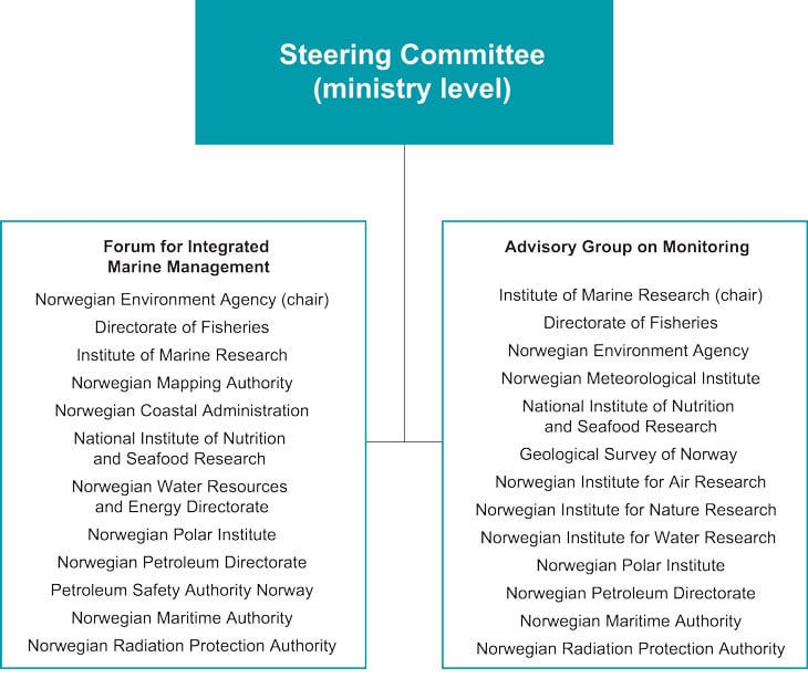 Work on the management plans brings together all relevant parts of the public administration (see Figure 2.1). It is coordinated by the interministerial Steering Committee for integrated management of Norway’s sea areas, which is headed by the Ministry of Climate and Environment. Other ministries represented in the committee are the Ministry of Labour and Social Affairs, the Ministry of Finance, the Ministry of Justice and Public Security, the Ministry of Local Government and Modernisation, the Ministry of Trade, Industry and Fisheries, the Ministry of Petroleum and Energy, the Ministry of Transport and Communications and the Ministry of Foreign Affairs.