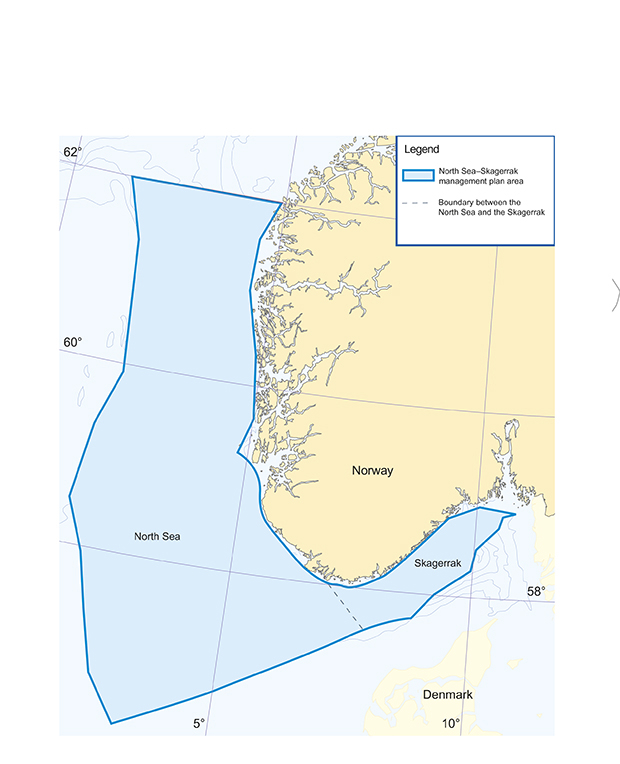 The area covered by the scientific basis for the management plan comprises the entire North Sea and Skagerrak, including waters along the coast and areas under the jurisdiction of other countries. The actual management plan and the measures described in it apply primarily to the open sea in the Norwegian part of the North Sea and Skagerrak, i.e. the areas outside the baseline, in Norway’s territorial waters and exclusive economic zone northwards to latitude 62 °N (off the Stad peninsula). The management plan does not cover areas within the geographical scope of the Planning and Building Act or the Water Management Regulations, with the exception of an overlap in the area from the baseline to one nautical mile outside the baseline. This means that the management plan does not determine the framework for activities in the coastal zone, such as fish farming. Environmental pressures from land-based and coastal activities are therefore categorised as external pressures in the management plan.