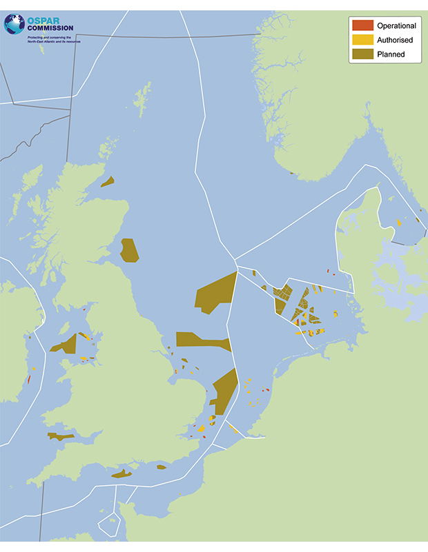Taken together, the four priority areas for development in the North Sea would produce 1.6–3.7 GW. In 2012, 30 wind farms, with a total capacity of 4.6 GW, had been installed and connected to the grid in the whole of the North-East Atlantic (the OSPAR area) (Figure 4.12). A further 61 wind farms had been authorised.