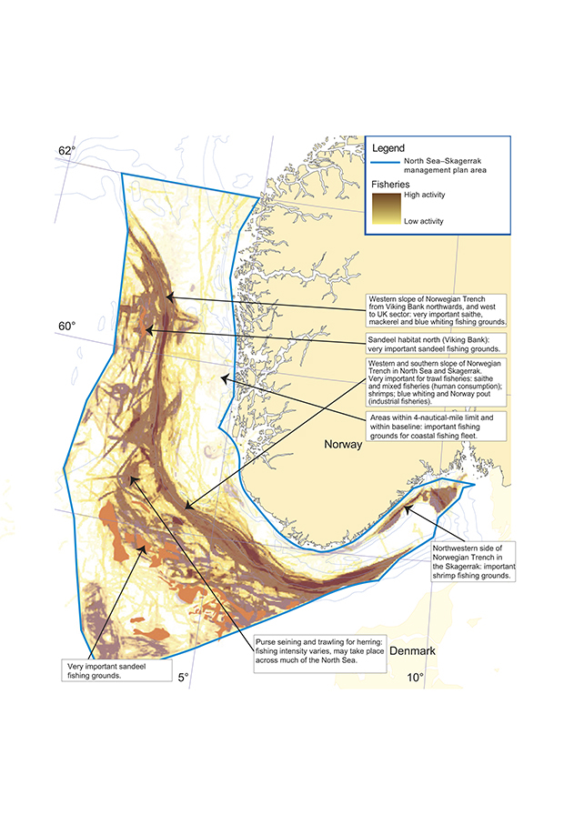 The North Sea and Skagerrak are surrounded by densely populated land areas, and living marine resources in these waters have been heavily exploited for generations. Harvesting has often been above sustainable levels, and earlier overfishing has resulted in a decline in catch sizes. One reason for this situation is that since the North Sea–Skagerrak area is surrounded by so many coastal states, it is under greater pressure than the Norwegian Sea and the Barents Sea–Lofoten area, and the management challenges are therefore more complex.