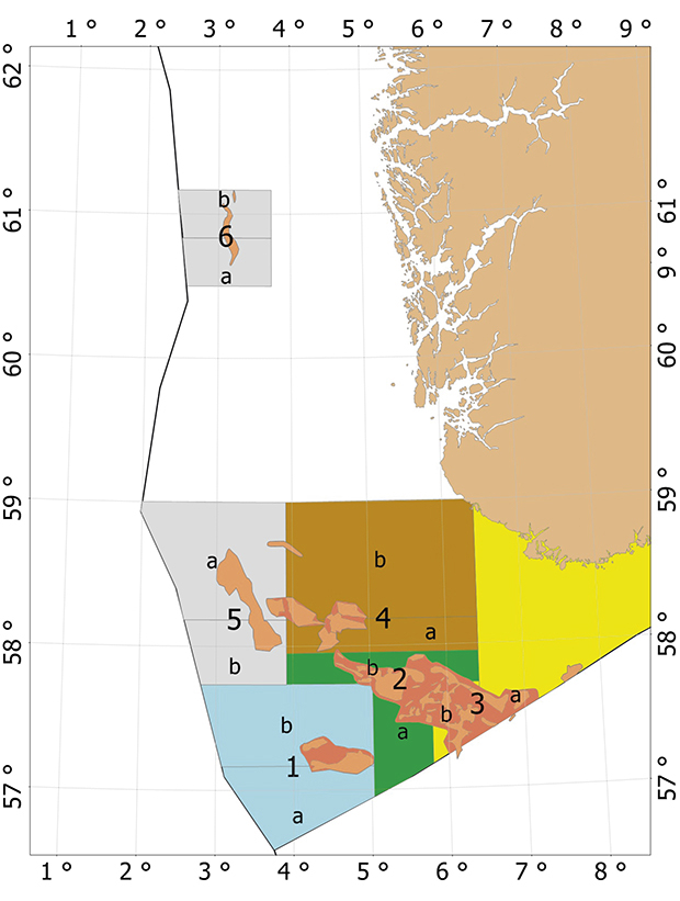 Closure of areas. Under the new model, sandeel habitat in the Norwegian zone has been divided into six areas, each of which has two subdivisions (marked a and b, see Figure 4.4). If the population in one area is estimated to exceed a predetermined level, one subdivision (either a or b) of the area is opened for fishing but not both. Subdivisions are opened and closed alternately from year to year.