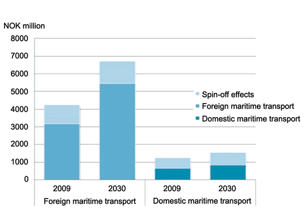 A general increase in the volume of freight transport is expected in the years ahead. One of the new goals of the national transport plan is to shift more freight from road to sea and rail. Maritime transport projections indicate an increase in distance sailed of 11 % in the North Sea and Skagerrak as a whole from 2009 to 2030. The increase is expected to be greatest (18 %) outside Norway’s Exclusive Economic Zone. Within the economic zone, the largest increase in traffic is expected for gas tankers and cargo vessels, while the distance sailed is expected to decline for offshore, supply and fishing vessels. The transport of oil from the Baltic through the Skagerrak is expected to increase by around 40 % up to 2030. Any change in activities will alter the traffic picture, and the demand for maritime transport is also influenced by global economic cycles.