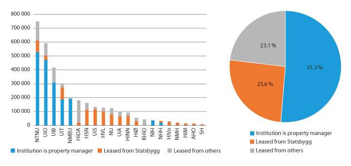The building stock at the disposal of public universities and university colleges has a total area of around 3.4 million square metres. The largest share, about half, is central government property for which the institutions themselves act as property managers. One quarter is managed by Statsbygg, and one quarter is leased in the private market. Following the structural reform of the higher education sector, most institutions have buildings in all three categories. Acting as property manager means that an institution is responsible for managing, maintaining and operating the buildings. Seven institutions, the University of Oslo, UiT The Arctic University of Norway, the University of Bergen, the Norwegian University of Science and Technology, the Norwegian University of Life Sciences, NHH Norwegian School of Economics and the Norwegian School of Sport Sciences, manage most of their buildings themselves and are considered to be property managers.5 For buildings managed by Statsbygg, the institutions pay rent to cover the cost of building management, operation and sufficient maintenance to preserve the value of the property, plus a fixed return on invested capital.