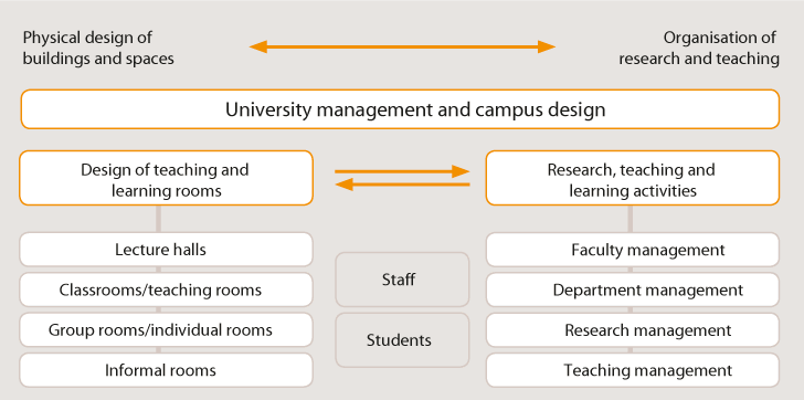 The development of teaching and learning practices must be coordinated with the design of teaching and learning rooms so that students thrive, learn what they are supposed to, complete their studies and achieve optimal learning outcomes. Campus development is part of organisational development and requires management accountability for and ownership of restructuring processes in all parts of the organisation. Figure 8.3 illustrates the links between the organisation of an institution and the physical design of buildings and spaces.
