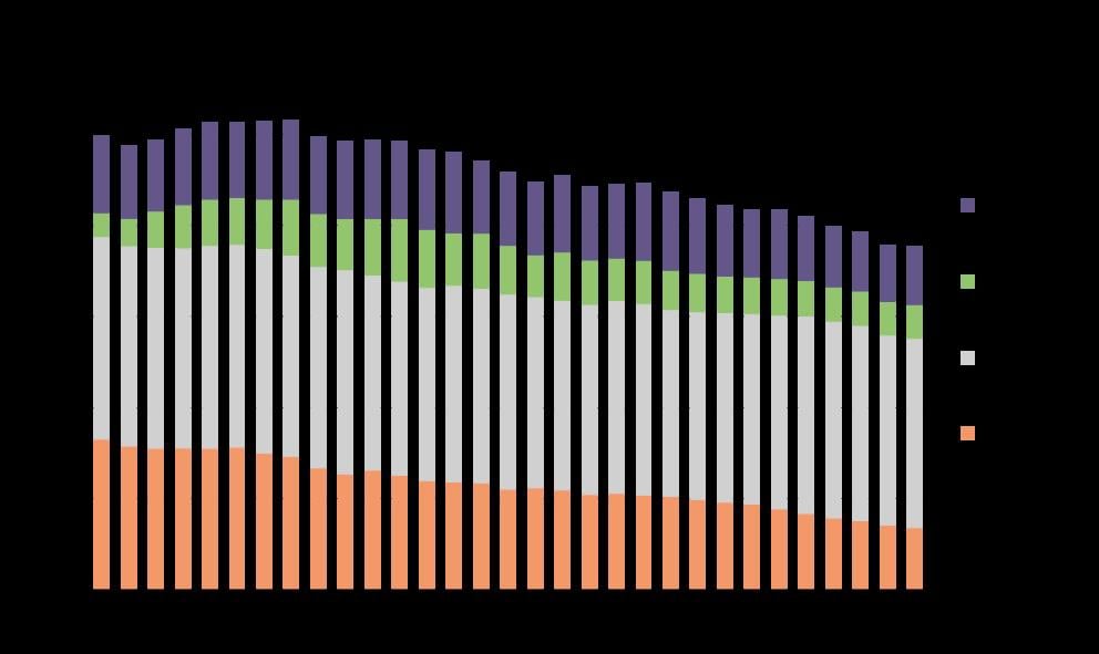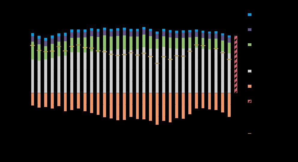 Figure 3.1 Total emissions of greenhouse gases by sources and removals from LULUCF in Norway, 1990–2020 (million tonnes CO2 equivalents), and preliminary emissions estimates for 2021