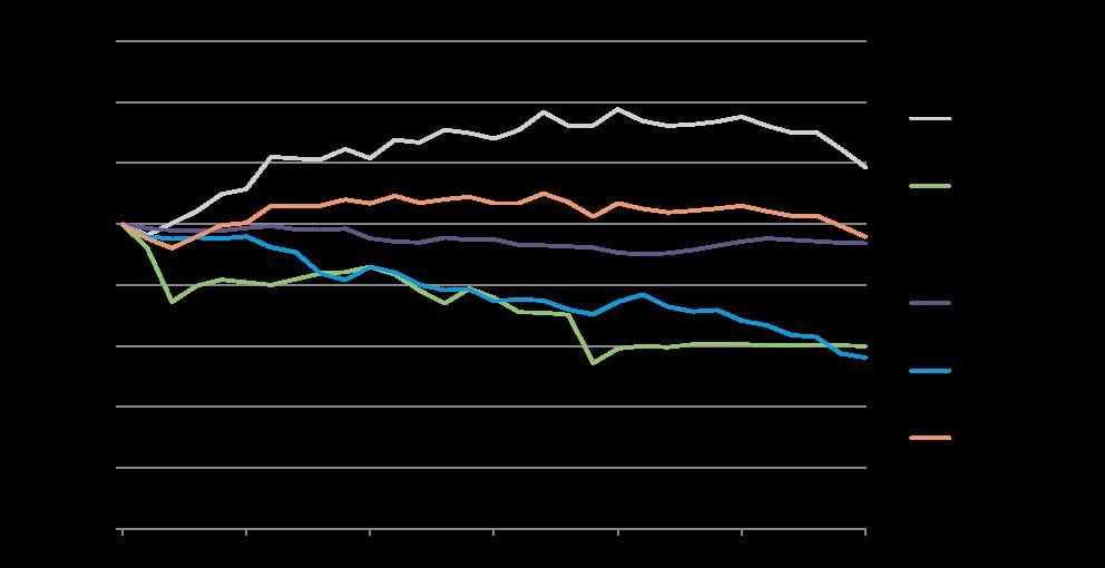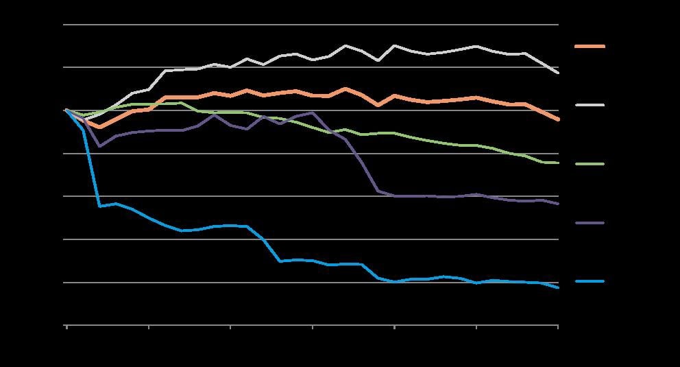 Figure 3.2 Changes in emissions of greenhouse gases, relative to 1990, illustrated by UNFCCC source categories, 1990–2020. Index 1990 = 1.
