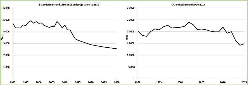 The emissions of BC and OC in 2020 were 2 907 and 10 304 tonnes respectively. The emission trends 1990–2020 and projections for BC and OC up to 2035 are shown in the figures below.