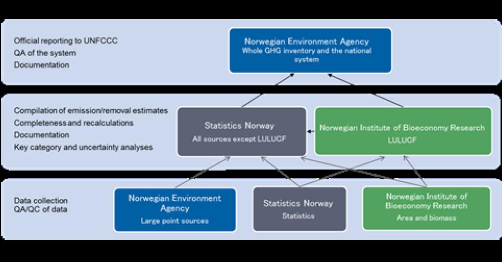 The Norwegian Environment Agency was appointed by the Ministry of Climate and Environment as the national entity pursuant to the Norwegian Government`s Parliament budget proposition for 2006. This appointment was renewed in 2015 through the budget proposition from the Ministry of Environment and Climate to the Norwegian parliament. The budget proposition stated that “The Norwegian system will build on existing organization and cooperation between the Norwegian Environment Agency, Statistics Norway and the Norwegian Institute of Bioeconomy Research. These three institutions are held individually responsible that their own contributions to the national system are in line with the guidelines from the climate convention on the calculation and archiving of emissions and removals of greenhouse gases. The Norwegian Environment Agency is still appointed as a national entity with overall responsibility for the inventory and reporting”. (St. prop. Nr. 1 (2014–2015)). As the national entity, the Norwegian Environment Agency is in charge of approving the inventory before official submission to the UNFCCC.