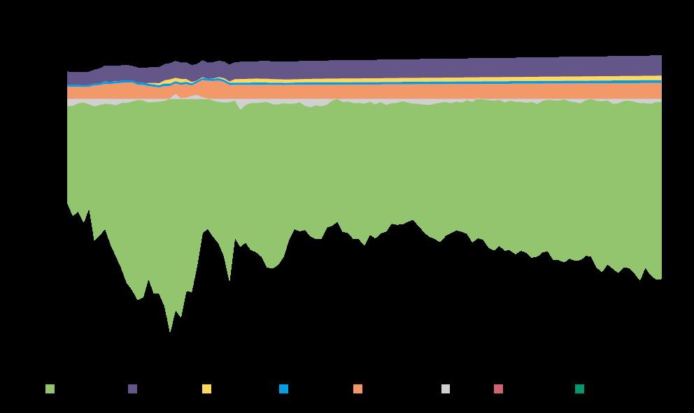 Figure 5.4 shows net removals and emissions of greenhouse gases from 1990 to 2020 (historical data) and projections until 2100 for all categories in accordance with the reporting to the UNFCCC. The categories include emissions from areas in transition to the category and areas remaining in their category (i.e. was the same category in 1990, or changed category more than 20 years ago).