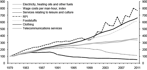 Figure 4.2 Real price developments for selected goods (nominal price growth less inflation as measured by RPI growth). 1979 = 100