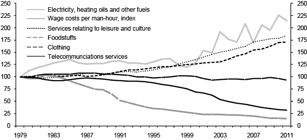 Chart 4.1 illustrates nominal price developments for different types of goods between 1979 and 2011. Retail price index developments are also indicated. Chart 4.2 illustrates real price developments (nominal price growth less inflation as measured by the retail price index) for these types of goods, and Table 4.1 specifies annual percentage growth in these and certain other real prices. We note that growth in real wages (real wage cost per hour for employers, but also the purchasing power of employees) has been 1.9 percent in the relevant period. The real price of clothing has declined by 3.6 percent, which is largely explained by the “China effect” on international prices and has very little to do with Norwegian wage cost growth (see for example Chapter 7 of Economic Analyses, 1/2011 (Statistics Norway, 2011). The real price of services relating to leisure and culture, on the other hand, has increased by 1.7 percent, which can largely be explained by domestic wage cost increases. The reduction in the real price of telecommunications services (5.8 percent) is principally caused by new technology and increased competition as the result of deregulation. We further note that the real price of foodstuffs has declined by 0.2 percent on average over the period, whilst electricity and heating oil prices have increased by an annual average of 2.4 percent. We also note from the table that annual inflation as measured by the retail price index was about 4.1 percent over the same period. Although historical figures do not necessarily say anything about the future, there is reason to believe that future price developments for different goods and services will continue to be differentiated.