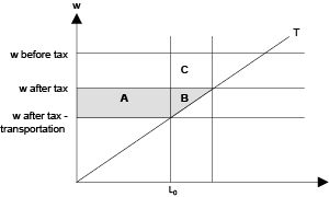What is the economic effect of the transportation measure? The disposable income of those who were already participating in the labour market will be higher after the elimination of the transportation costs. This is represented by area A in Chart 7.2. Moreover, the increase in labour supply, either by those who participated in working life increasing the number of hours worked or by new people entering the labour market, will benefit the employees involved, inasmuch as what they earn from work exceeds their value of leisure. This is represented by areas A and B in Chart 7.2. These effects will be captured by an ordinary cost-benefit analysis. However, the value of the production generated by the increase in labour supply corresponds to the wage before tax. The difference between the economic value of increased employment and the value reflected in individual decisions is represented by area C in Chart 7.2. This corresponds to the value of the increase in tax revenues resulting from increased employment, and represents a net wider impact of increased employment in an economy with a tax on labour income.