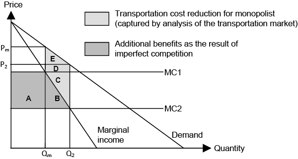 Let us look at a firm operating in a market characterised by imperfect competition, which firm may therefore charge a price in excess of marginal cost. Assume also that the said firm is facing transportation costs that vary in proportion with its production level, thus implying constant marginal costs. In Chart 7.3, this is illustrated by a monopolist, and the profit-maximising price and output of the monopolist is given by the point Pm, Qm. If a transportation project results in lower transportation costs for the firm, this will, all else being equal, mean lower marginal costs for the firm, illustrated by a shift in the marginal cost curve from MC1 to MC2. The firm responds to the lower production costs by reducing its price and increasing its production to P2, Q2. The area A+B corresponds to the benefits captured as the value of reduced generalised travel costs for the business sector in an ordinary cost-benefit analysis. We note from Chart 4.3 that, since the firm is able to charge a price in excess of marginal costs, consumers’ willingness to pay for one additional unit (as illustrated by the demand curve) exceeds the cost of producing such unit (the marginal cost curve). When production is expanded, this results in an efficiency benefit that is additional to that captured by an ordinary cost-benefit analysis. Such additional efficiency benefit is illustrated by the area C+D+E in Chart 7.3. This efficiency benefit is not captured by the firm and represents net wider impacts of expanded production in markets with imperfect competition.