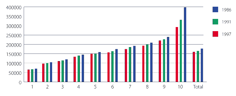 | Figure 1Distribution of income 1986–1997. Equivalent household income. Decile shares. |