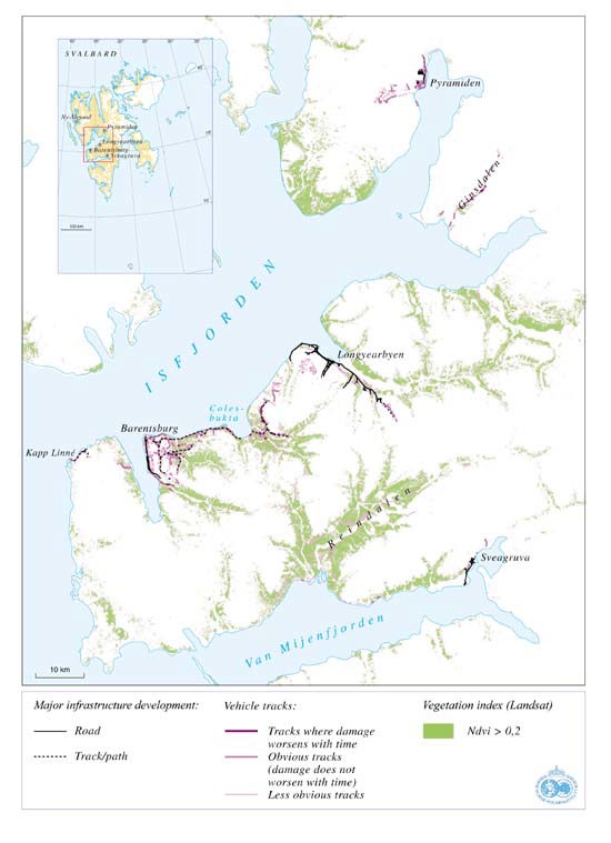 Figure 6.2 Major infrastructure development and mechanical damage from vehicle tracks in areas in central Spitsbergen where there is continuous vegetation cover.