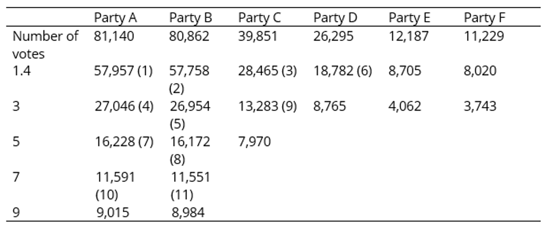 An example of the determination of the election result under the modified Sainte-Laguës method is shown in the table below, where 11 seats need to be allocated. In this example, consideration has not been made for the fact that municipal council election can cast cross-party votes, which can also affect the allocation between parties.