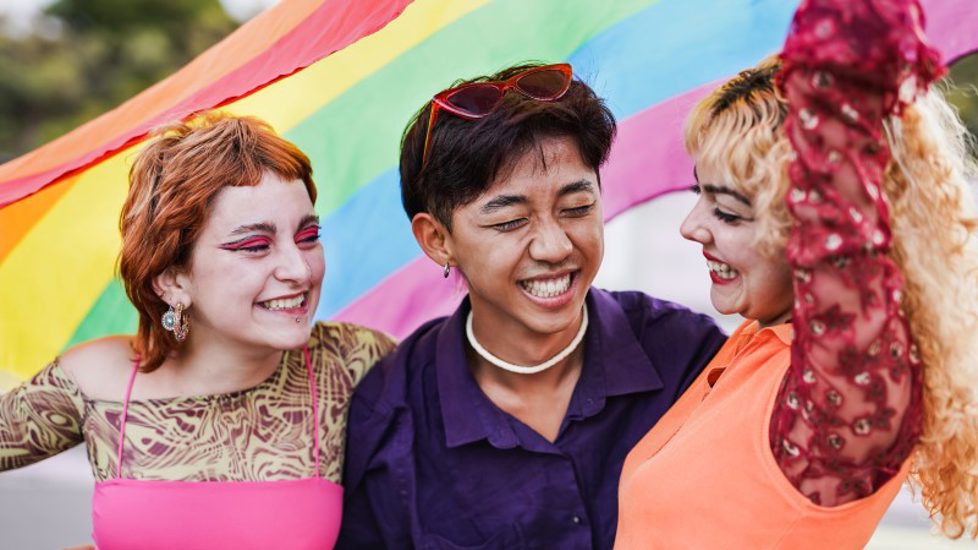 Illustrasjonsbilde med tre ungdommer med prideflagg i bakgrunnen Foto: Gettyimages