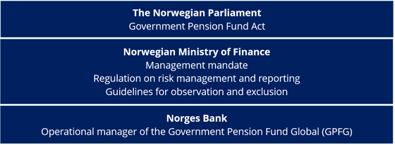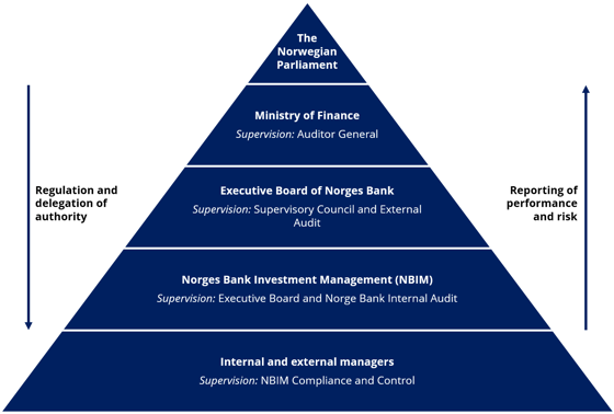 The management of the GPFG is based on a governance structure in which the Storting, the Ministry of Finance, Norges Bank's executive board and Norges Bank Investment Management (NBIM) have different roles and responsibilities. Sound control and supervisory bodies are in place at all management levels of the Fund. Regulations and delegation authorisations will necessarily be more detailed further down the pyramid.
