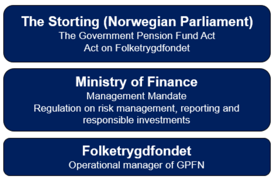 The Storting has in the Government Pension Fund Act, made the Ministry of Finance responsible for the management of the Government Pension Fund Norway (GPFN). The operational management of the Fund is carried out by Folketrygdfondet.