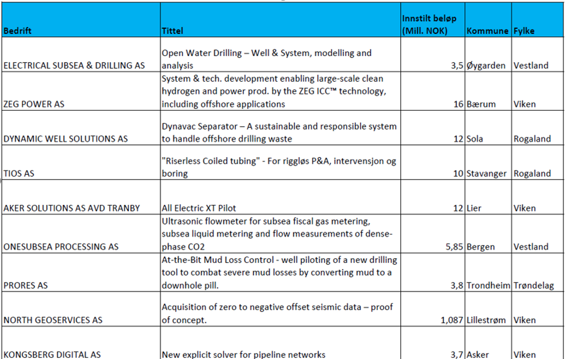 Et eksempel er bedriften ZEG Power på Fornebu utenfor Oslo. De får støtte på til sammen 16 millioner kroner for å utvikle ny teknologi for hydrogenproduksjon kombinert med CO2-fangst, til bruk både offshore og på land. Dersom de lykkes, kan dette være et viktig bidrag i energieffektivisering og reduksjon av klimagassutslipp på norsk sokkel i årene framover.