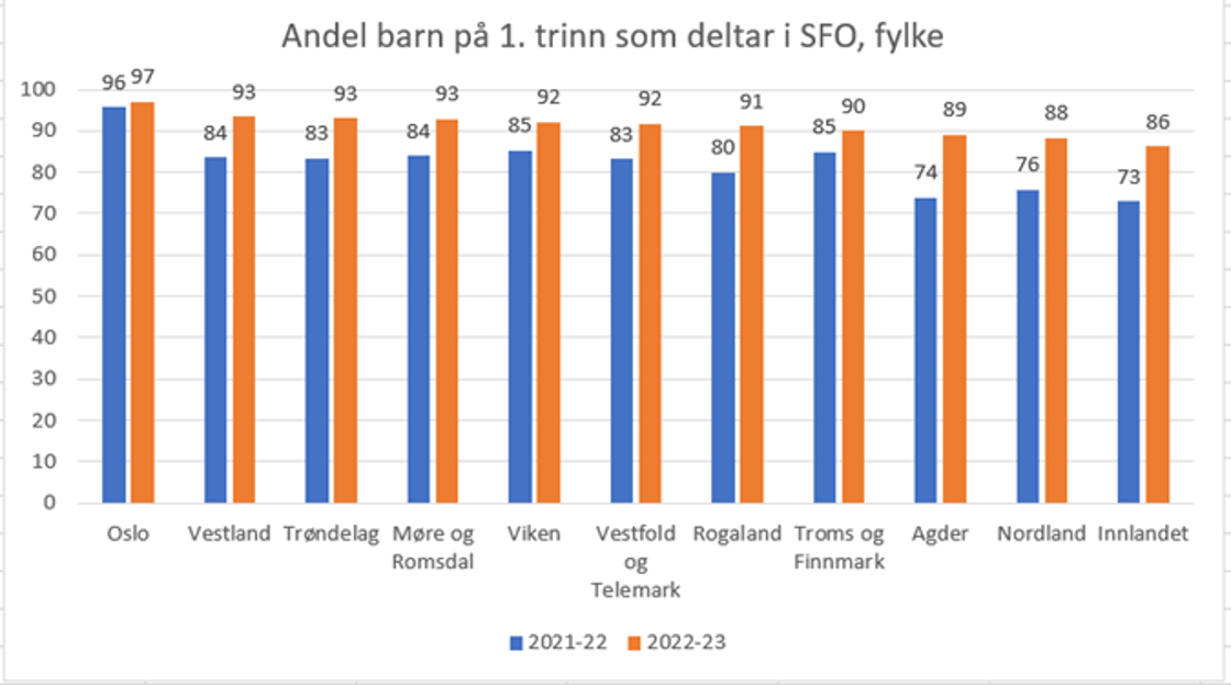 Hele 92 prosent av førsteklassingene deltar nå i skolefritidsordningen (SFO), en økning fra 83 prosent høsten 2021. Det har også vært en økning i deltakelsen på 2.-4.trinn.