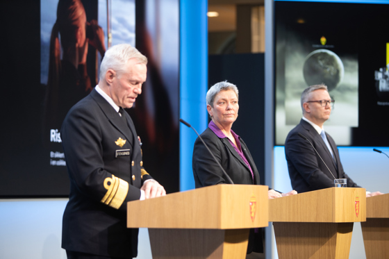 Forsvarsminister Tore O. Sandvik (Ap) og justis- og beredskapsminister Astri Aas-Hansen (Ap) innledet på pressekonferansen. Deretter presenterte sjef for Etterretningstjenesten, Nils Andreas Stensønes, sjef Politiets sikkerhetstjeneste, Beate Gangås, og sjef Nasjonal sikkerhetsmyndighet, Arne Christian Haugstøyl, sine vurderinger rundt aktuelle sikkerhetsutfordringer.