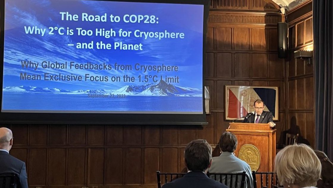 Klima- og miljøminister Espen Barth Eide ledet møte om «The Road to COP 28: Why 2 C is Too High». Verdens isbreer og permafrostarealer smelter i et stadig raskere tempo. Fram mot COP 28 vil Norge sammen Chile og Island rette søkelyset mot betydningen av å begrense global oppvarming til 1,5 grader for å bevare så mye is så lenge som mulig.