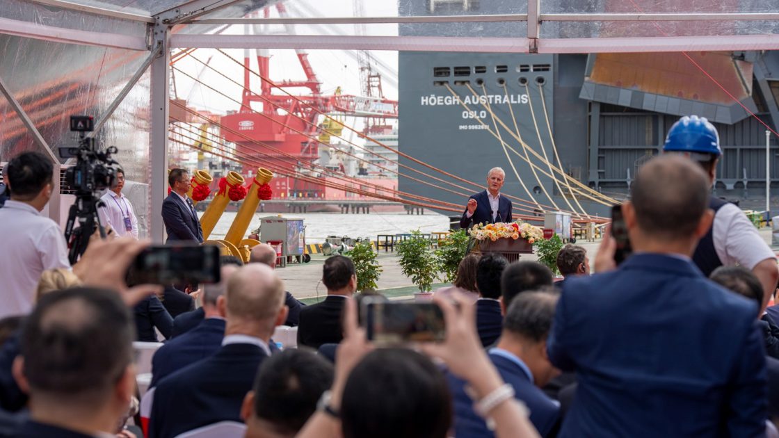 Statsministeren holdt en tale under navneseremonien til skipet Höegh Borealis, det andre av tolv lignende skip i Aurora-klassen som Höegh får laget ved verftet China Merchants Heavy Industry (CMI).
