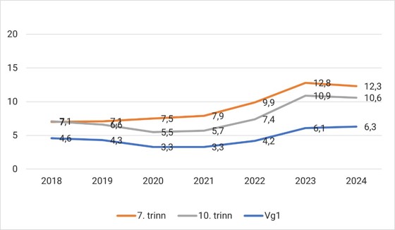 Elevundersøkelsen 2024, som Utdanningsdirektoratet publiserer i dag, viser at andelen elever som opplever mobbing ligger på 12,3 prosent på 7. trinn, 10,6 prosent på 10. trinn og 6,3 prosent på vg1. Det er omtrent på nivå med året før. (se figur)