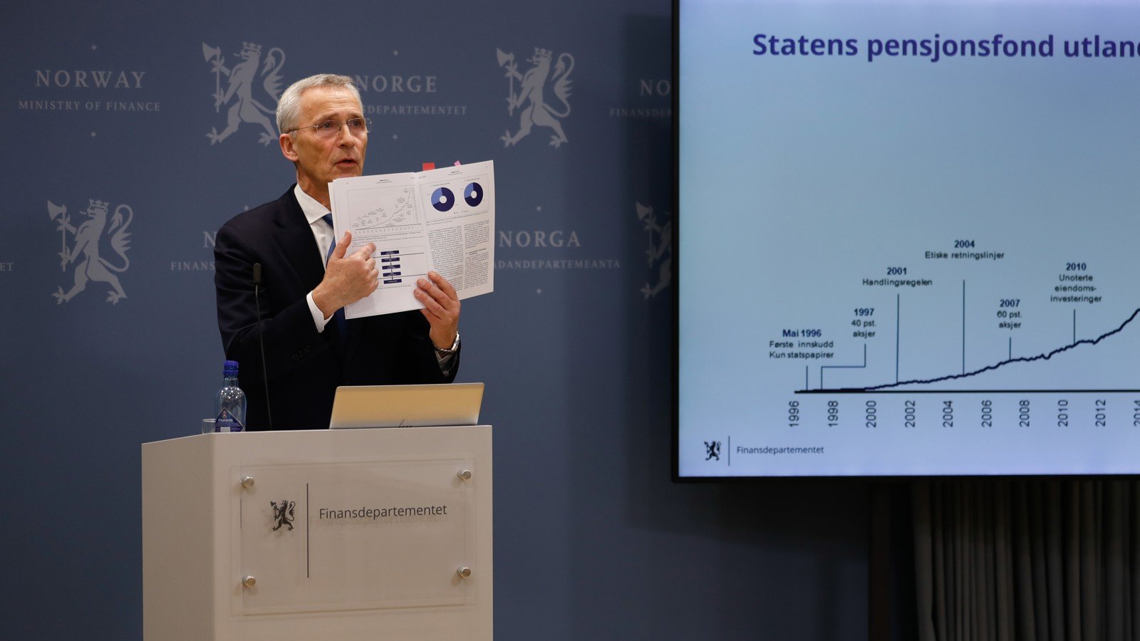 Finansminister Jens Stoltenberg legger frem stortingsmeldingen om Statens pensjonsfond 2025.