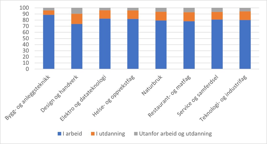 Sysselsettingen varierer også mellom utdanningsprogrammene. De som har gått bygg- og anleggsteknikk har høyest sysselsettingsgrad, med 89 prosent. Lavest sysselsettingsgrad har de som har gått design og håndverk. Der er 74 prosent av de nyutdannede i jobb ett år etter at de har tatt fagbrev.