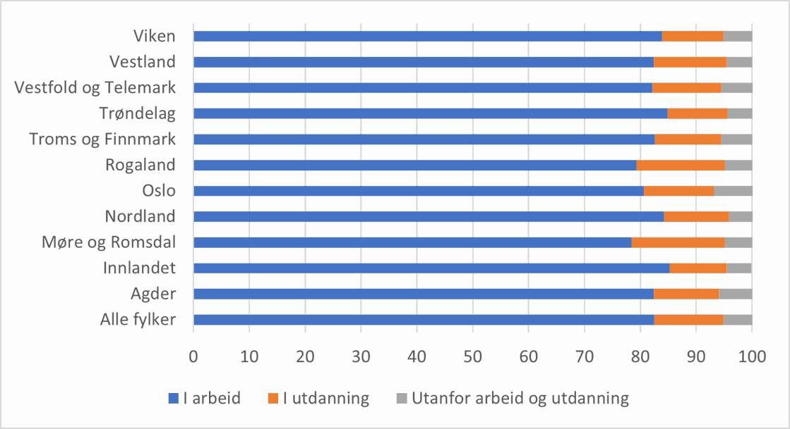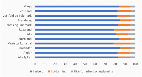Hvor mange som kommer i jobb året etter fagprøven varierer mellom fylkene. Andelen er størst i Innlandet og Trøndelag med 85 prosent. I Nordland er 84 prosent i jobb ett år etter utdanningen. Andelen er lavest i Møre og Romsdal med 78 prosent.