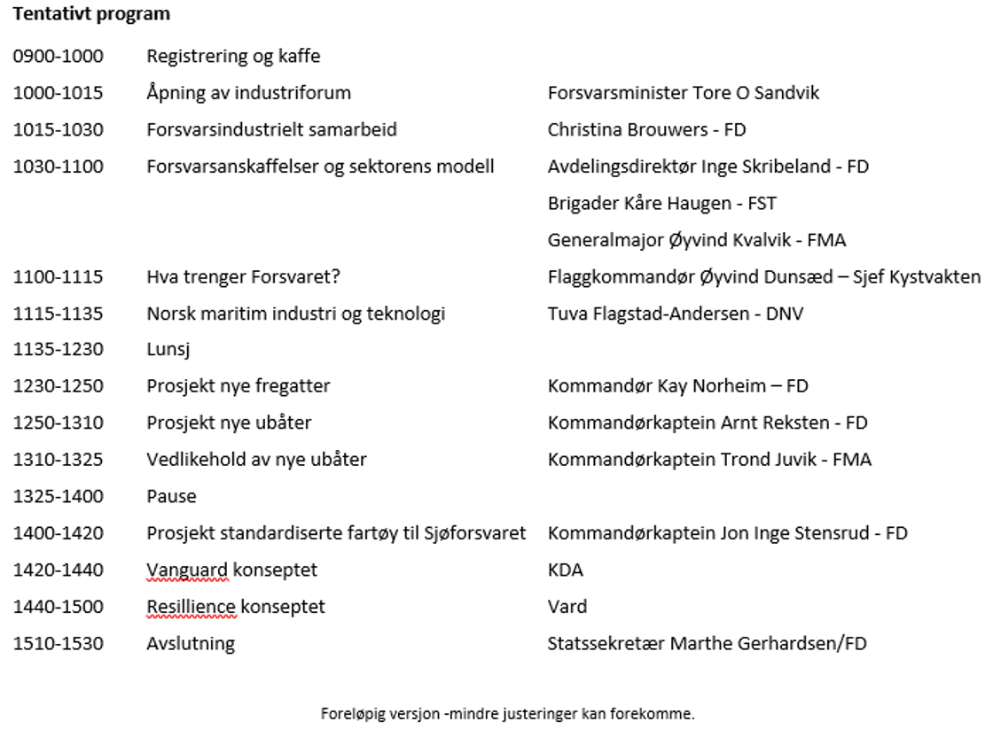 – Industriforumet skal blant annet tilrettelegge for kontakt mellom forskjellige deler av norsk industri som ønsker å ta del i design, utvikling, produksjon og levetidsunderstøttelse av standardiserte fartøy. Vi søker eksempelvis etter bedrifter med ideer eller løsninger for understøttelse, vedlikehold, trening av personell som kan bidra til enklere, rimeligere og bedre drift av disse fartøyene vi skal anskaffe. Oppstartskonferansen er åpen for alle som ønsker informasjon, og som ønsker å knytte kontakt med andre industriaktører, avslutter forsvarsministeren.