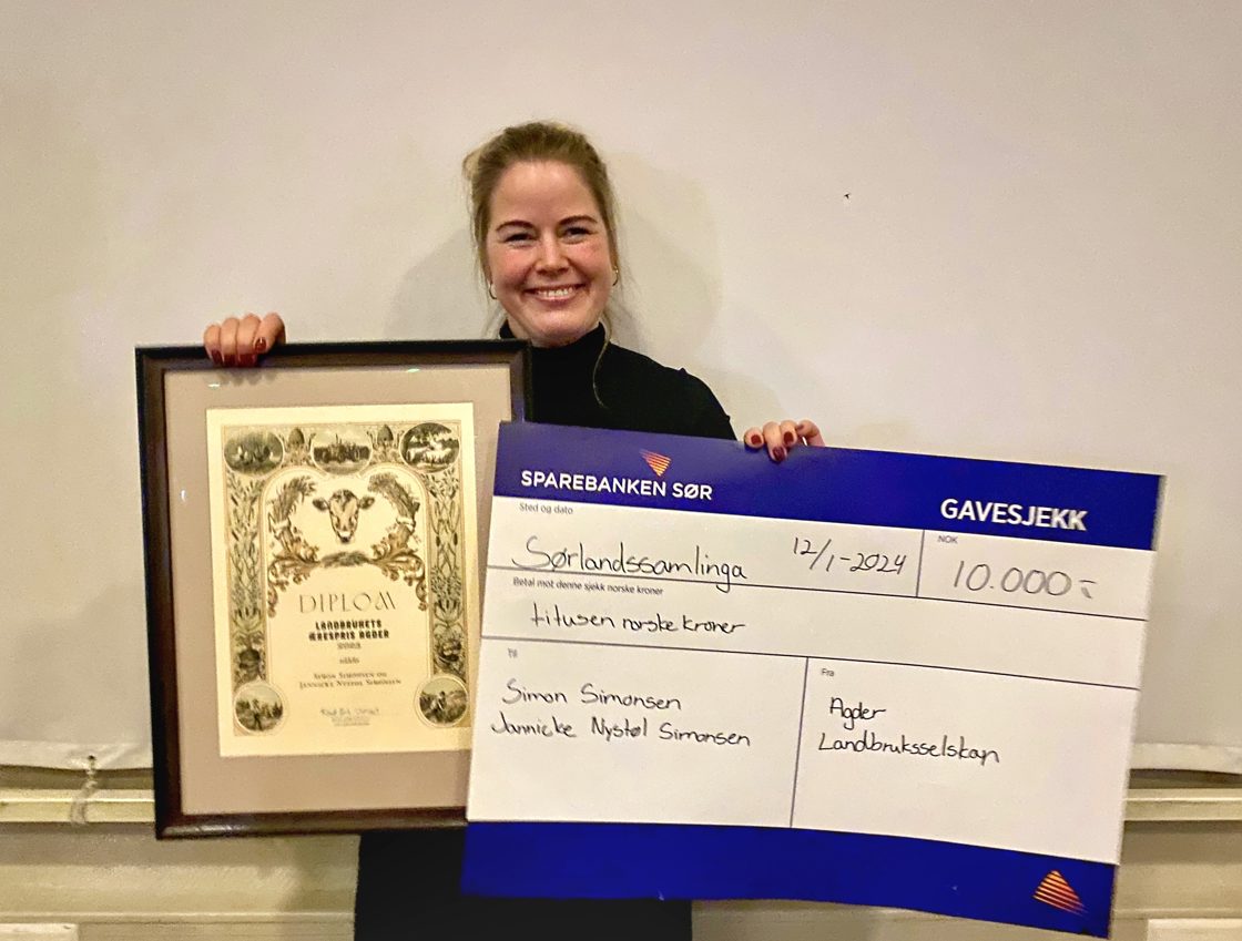 Landbrukets ærespris, vekket opp av mange års dvale, ble delt ut av Agder landbruksselskap v/leder Knut Erik Ulltveit. Prismottakerne var Jannicke Nystøl Simonsen og Simon Simonsen fra Lindesnes. De har vært åpne om både gode og vonde sider av livet som bønder og vist pågangsmot, initiativ og nytenking. Utvikling kan skje på tross av og ikke alltid på grunn av. I tillegg inviterer de til samarbeid både gjennom deling av erfaring og opplevelser og ved å legge til rette for kontaktpunkter som får betydning for nærmiljøet og skaper interesse for landbruk og matproduksjon. Simon og Jannicke har drevet gården siden 2009, investert i melk og kjøttproduksjon og har nylig åpnet en ny og større gårdsbutikk.