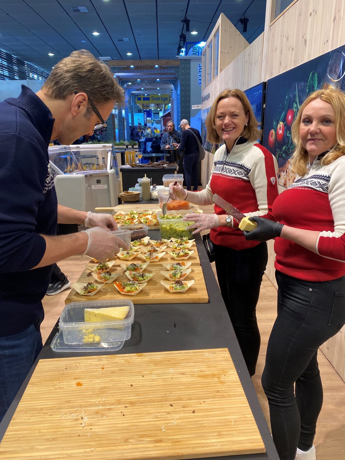 Grüne Woche har, grunna covid, hatt eit 2 års opphald. Og det kunne vi merke: interessa for messa var stor. Fjord-Noreg sin stand var svært populær! Kokkane sette saman små smaksmenyar av produsentane sine kjøt- og fiskeprodukt, mens resten av delegasjonen skar opp ost, speka kjøtt og røyka laks, danderte og selde smaksprøver. Bestseljarane vart som forventa einerøykt laks, ost og sider. Produkt med geit- og kjekjøt vart også, etter litt nøling, godt tatt imot.
