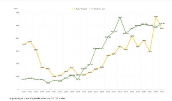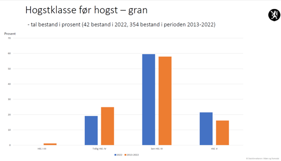 For tidleg hogst er uheldig med tanke på nytte den gode tilveksten i våre skogar, både for klima og økonomi. I vårt fylke vert framleis rundt 80 prosent av grana avverka før den er hogstmoden.