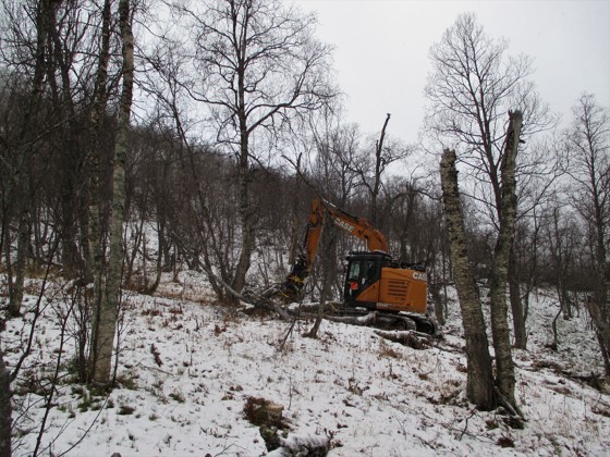 I de bratte lauvskogliene i Sørdalen i Bardu er det for tiden stor aktivitet med hogst av biovirke. Entreprenøren T. Hilmarsen Biobrensel har to lassbærere som går i kontinuerlig transport med heltre av bjørk i den bratte lia. Virket er hogd med gravmaskin påmontert et klippeaggregat.