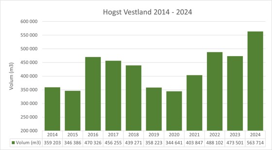 Det er i all hovudsak gran som vert hogd i Vestland. Av innmålt volum utgjer gran 95 % . Dette er for det meste norsk gran, men også 60 000 m3 sitkagran. Ein har hatt andre år med meir sitkagran, så den relative delen sitkagran har ikkje vore rekordhøg i 2024.